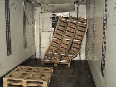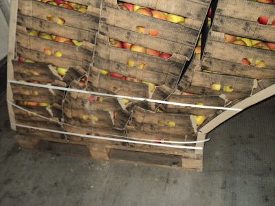 Поставили впереди машины 1 паллет польских яблок и ничем его не закрепили. В результате груз приехал вот в таком состоянии: